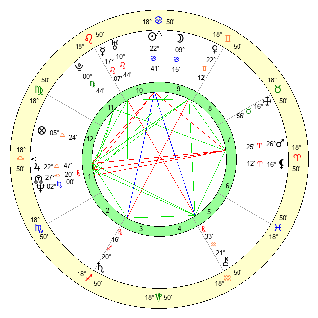 | Sun | 22 Cancer 41 | 23 Cancer 27 | 27 Virgo 13 |