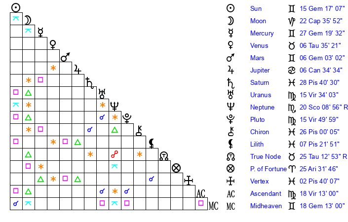 | Pluto | 15 Virgo 50 | 3 Aquarius 34 | 16 Virgo 58 |