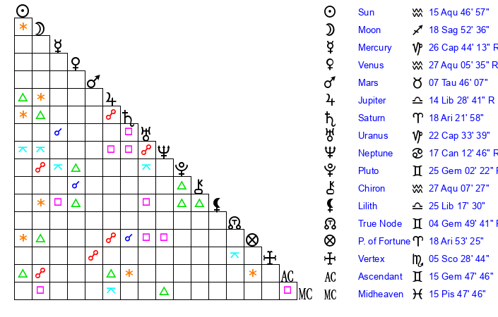 | Sun | 15 Aquarius 47 | 16 Aquarius 53 | 9 Gemini 6 |