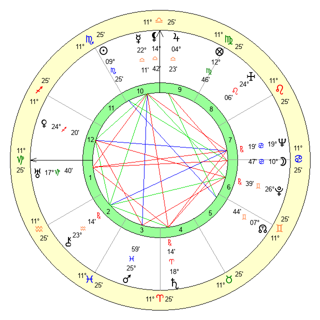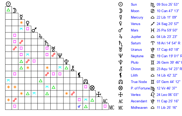 | Sun | 9 Scorpio 25 | 10 Scorpio 33 | 6 Pisces 0 |