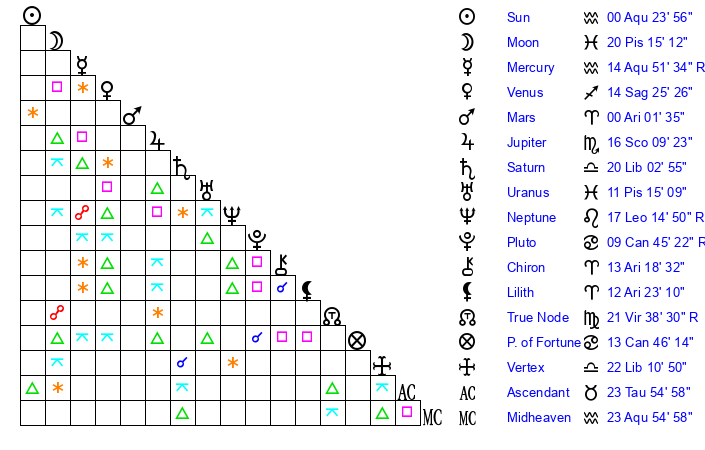 Moon | 20 Pisces 14 | 27 Libra 15 | 17 Sagittarius 54 |