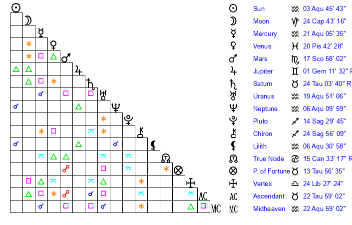 Uranus | 19 Aquarius 51 | 23 Taurus 18 | 21 Aquarius 14 |
