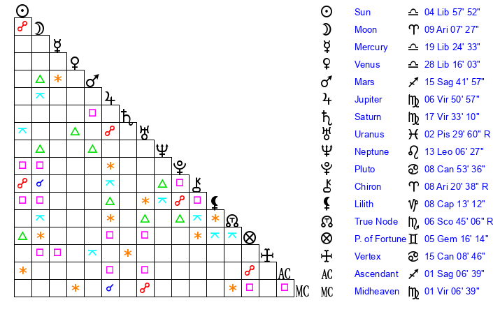 Moon | 9 Aries 8 | 18 Sagittarius 2 | 14 Aquarius 30 |