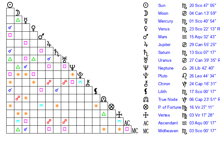 | Saturn | 13 Scorpio 34 | 25 Pisces 14 | 20 Scorpio 31 |