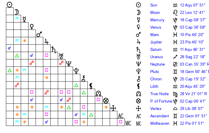 | Moon | 22 Leo 7 | 4 Aries 52 | 29 Capricorn 7 |