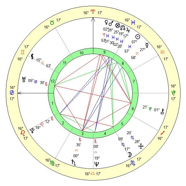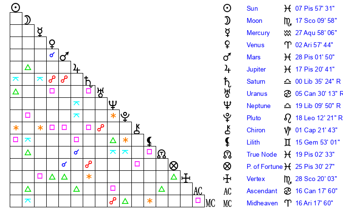 | Sun | 7 Pisces 58 | 9 Pisces 1 | 20 Taurus 50 |