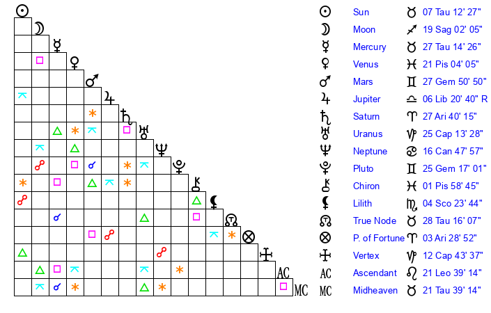 | Sun | 7 Taurus 13 | 8 Taurus 21 | 27 Leo 26 |