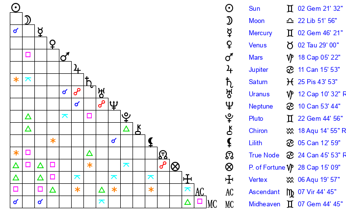 | Moon | 22 Libra 49 | 29 Aries 41 | 26 Aquarius 23 |