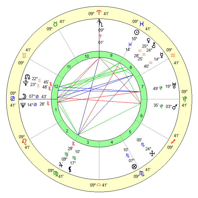 | Moon | 7 Cancer 44 | 0 Aries 36 | 29 Virgo 44 |