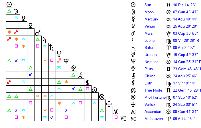 | Sun | 10 Pisces 14 | 11 Pisces 6 | 3 Cancer 13 |