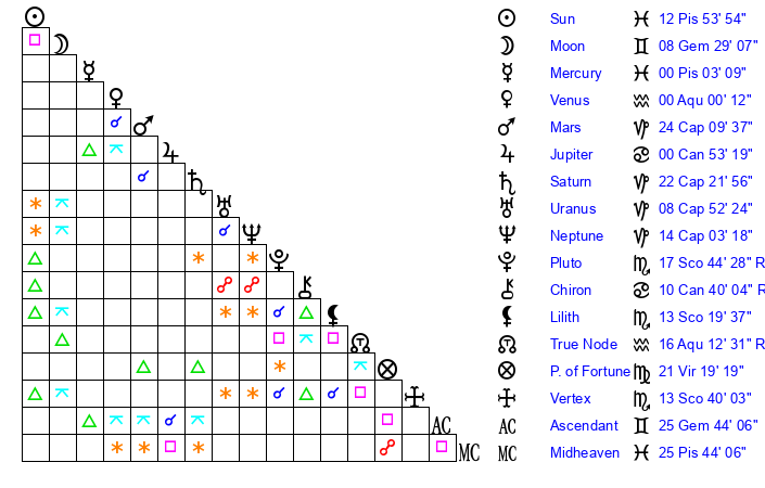| Sun | 12 Pisces 54 | 13 Pisces 24 | 17 Aries 39 |