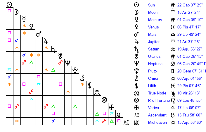 | Sun | 22 Capricorn 37 | 23 Capricorn 30 | 22 Taurus 0 |