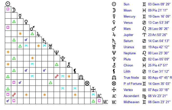 | Sun | 3 Gemini 9 | 3 Gemini 46 | 17 Virgo 37 |