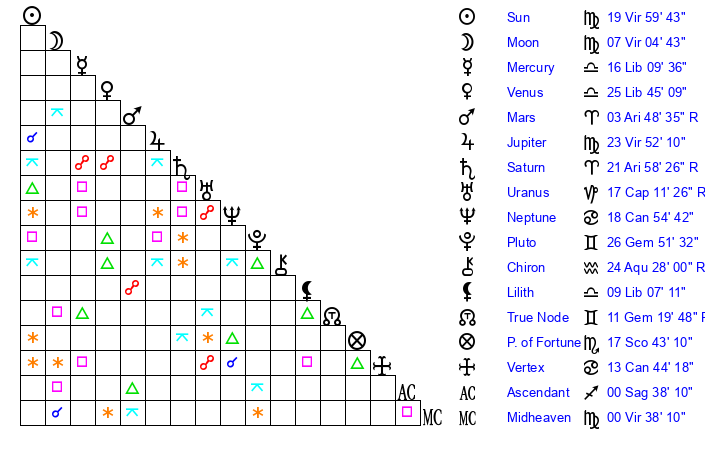 | Sun | 20 Virgo 0 | 20 Virgo 55 | 16 Capricorn 18 |