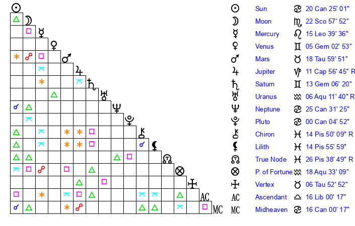 | Sun | 20 Cancer 25 | 21 Cancer 19 | 9 Scorpio 25 |