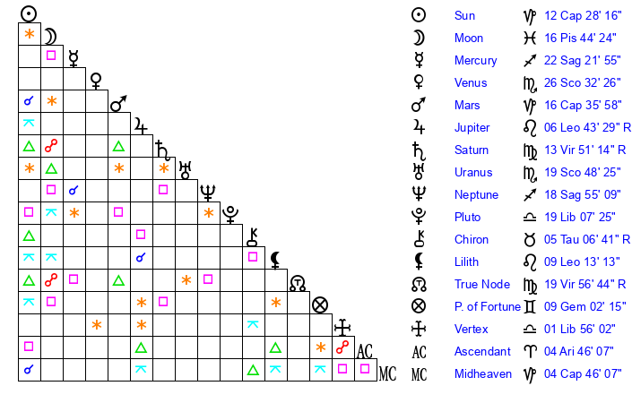 | Sun | 12 Capricorn 28 | 13 Capricorn 19 | 29 Aquarius 12 |