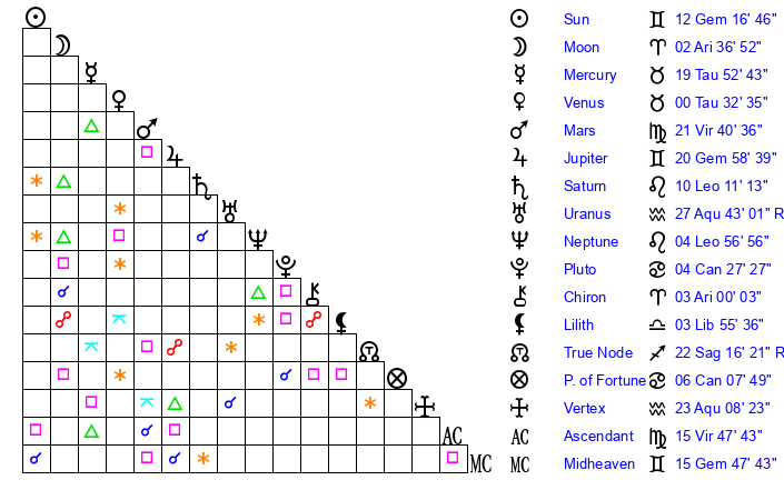 Mercury | 19 Taurus 53 | 18 Gemini 58 | 7 Virgo 6 |