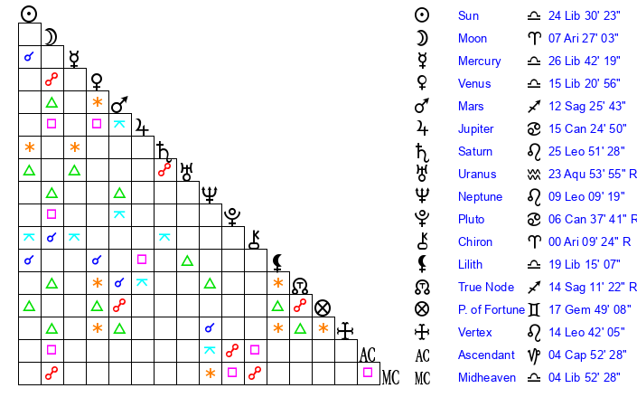 Sun | 24 Libra 30 | 25 Libra 34 | 12 Aquarius 49 |