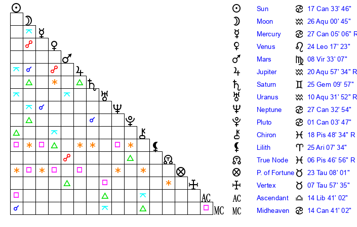 | Neptune | 27 Cancer 33 | 2 Aries 9 | 0 Leo 27 |