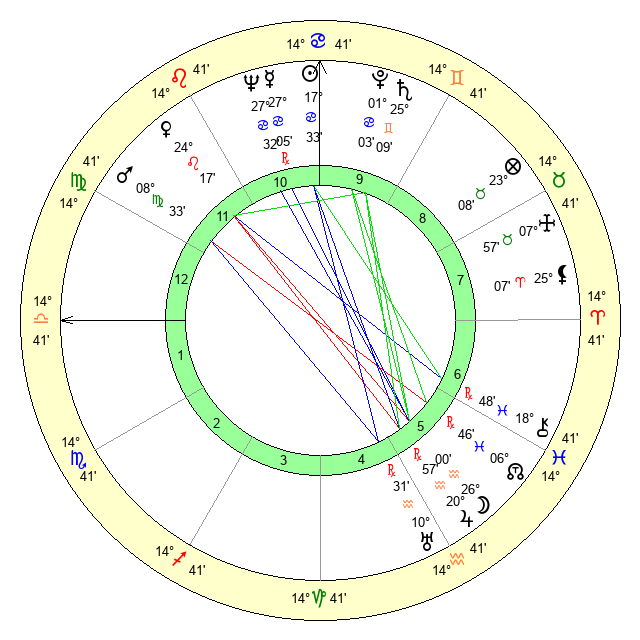 | Sun | 17 Cancer 34 | 18 Cancer 41 | 5 Scorpio 26 |