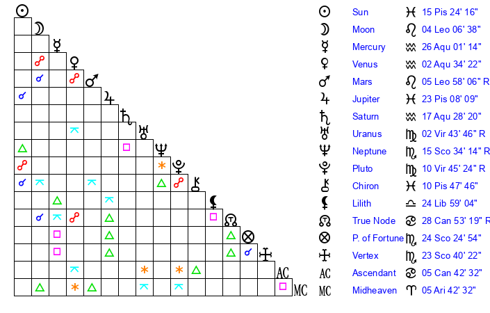| Moon | 4 Leo 4 | 16 Gemini 40 | 5 Scorpio 16 |