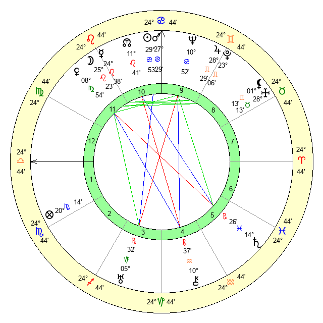 | Sun | 29 Cancer 54 | 1 Leo 5 | 26 Scorpio 28 |