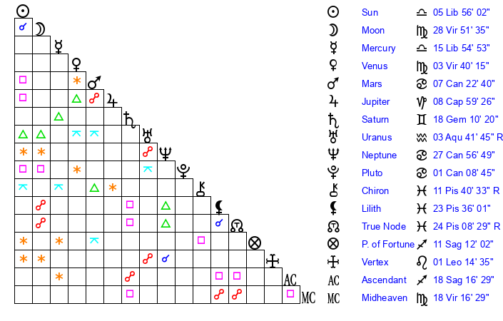 | Mercury | 15 Libra 55 | 19 Libra 7 | 25 Capricorn 6 |