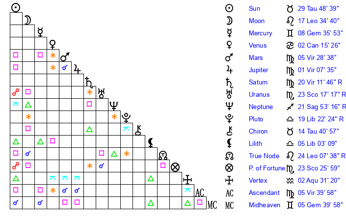 | Saturn | 20 Virgo 36 | 29 Pisces 33 | 22 Virgo 7 |