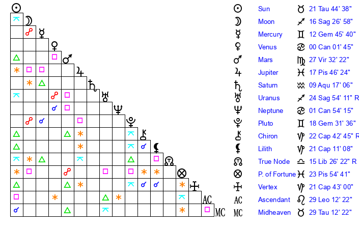 | Moon | 16 Sagittarius 21 | 4 Sagittarius 13 | 25 Taurus 20 |