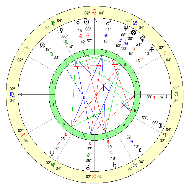 | Moon | 6 Aries 49 | 11 Scorpio 41 | 13 Virgo 8 |