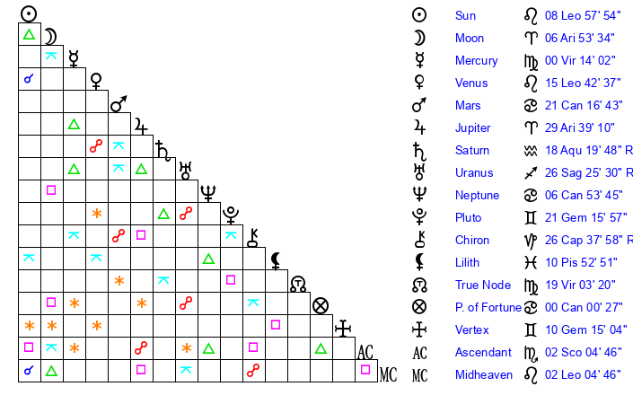 | Moon | 6 Aries 49 | 11 Scorpio 41 | 13 Virgo 8 |