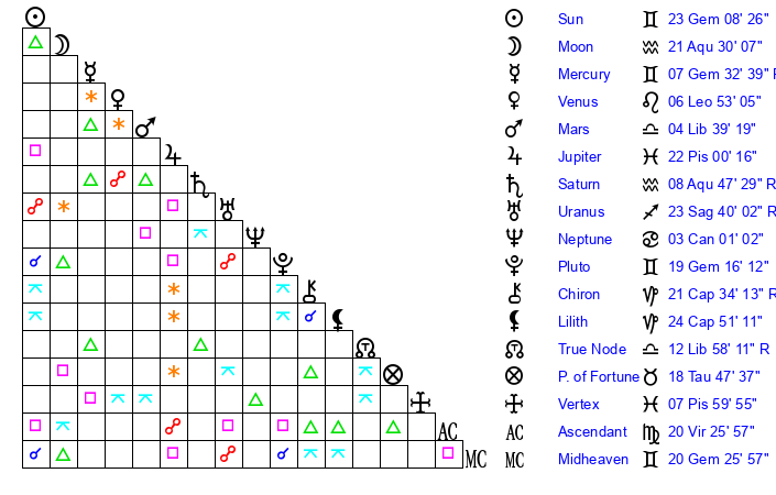 | Pluto | 19 Gemini 17 | 3 Aquarius 25 | 20 Gemini 37 |