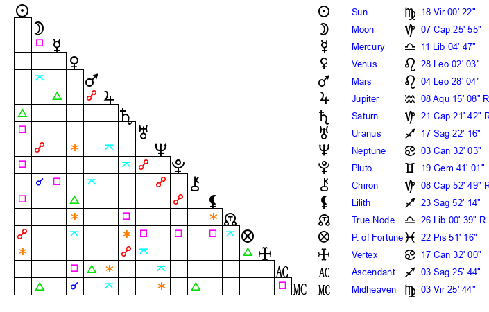 | Sun | 18 Virgo 0 | 19 Virgo 12 | 21 Capricorn 20 |