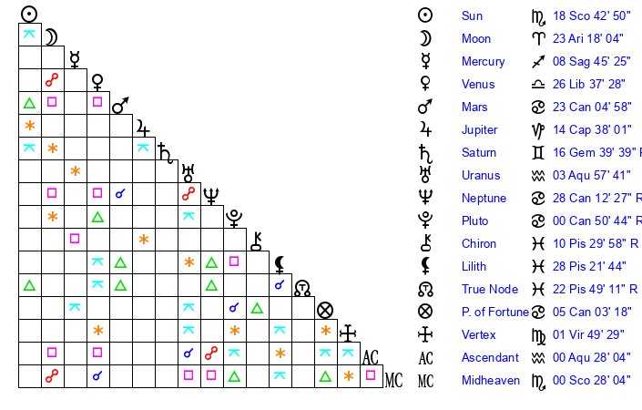 | Moon | 23 Aries 22 | 21 Pisces 59 | 13 Taurus 12 |