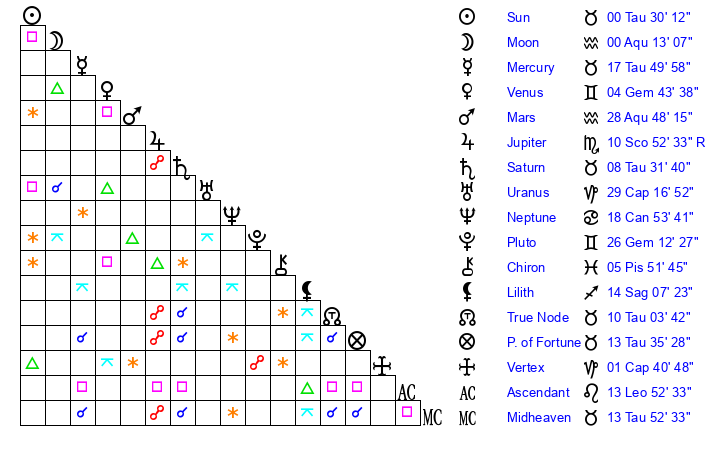 | Sun | 0 Taurus 30 | 1 Taurus 53 | 19 Leo 51 |