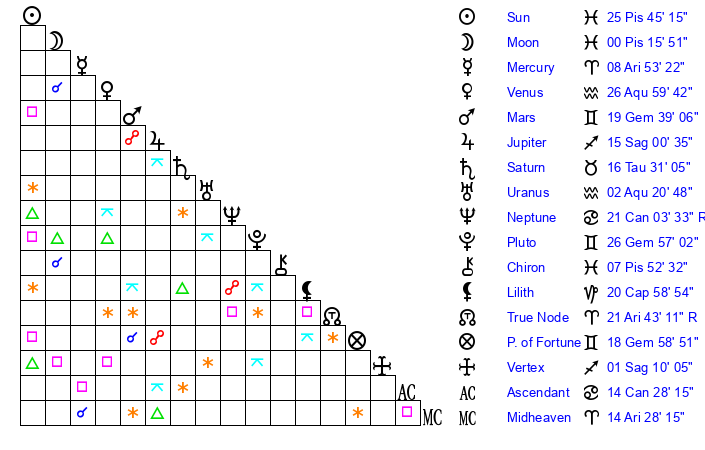 | Moon | 0 Pisces 14 | 22 Libra 44 | 15 Aries 5 |