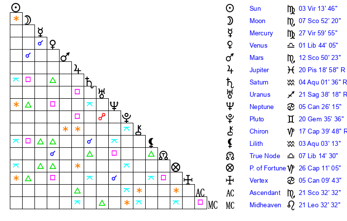 | Mercury | 28 Virgo 0 | 19 Leo 21 | 23 Capricorn 27 |