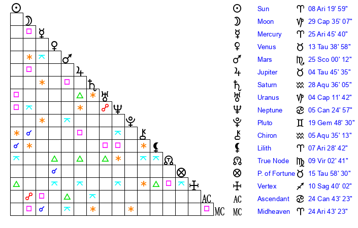 | Sun | 8 Aries 20 | 9 Aries 15 | 3 Leo 57 |