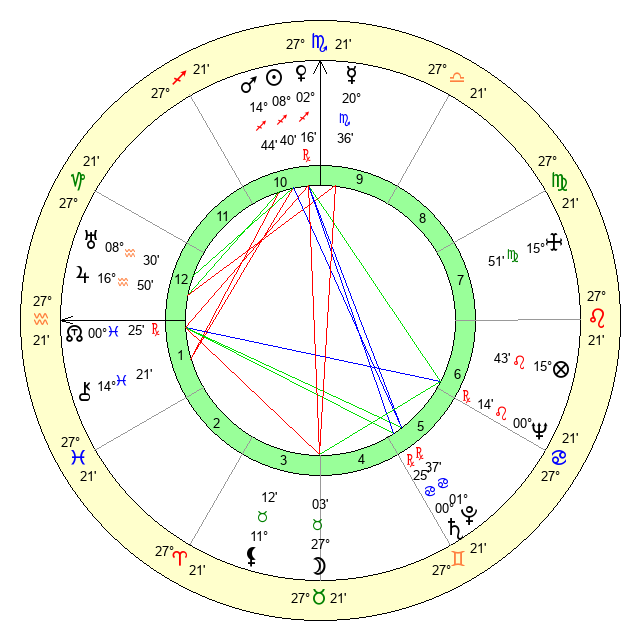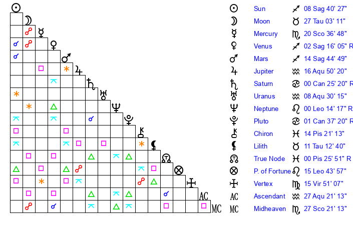 | Moon | 27 Taurus 5 | 15 Sagittarius 10 | 5 Gemini 23 |