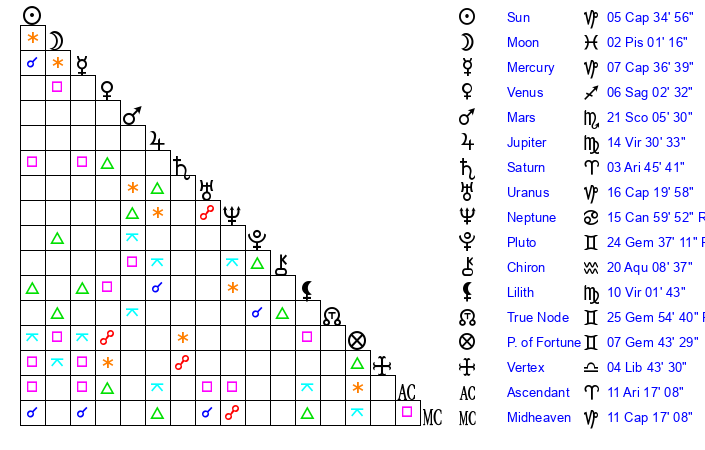 | Pluto | 24 Gemini 37 | 0 Aquarius 56 | 24 Gemini 10 |