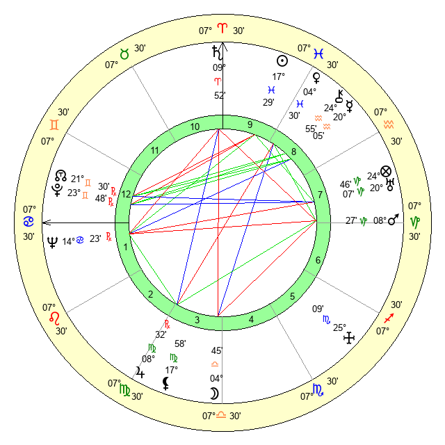 | Moon | 4 Libra 45 | 13 Cancer 43 | 0 Capricorn 2 |