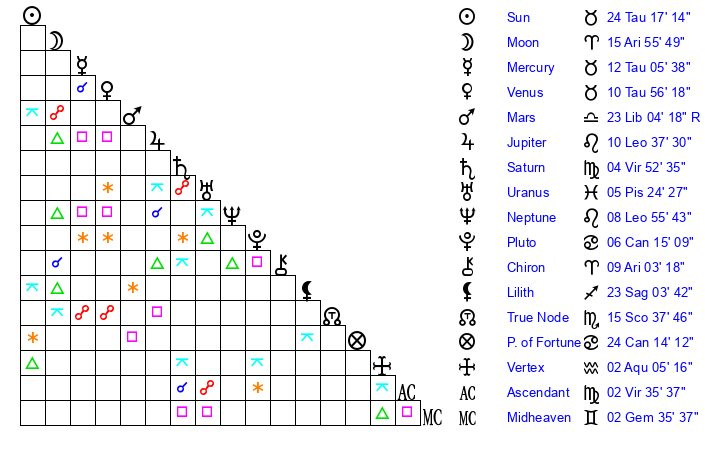 Moon | 15 Aries 53 | 25 Sagittarius 26 | 22 Aquarius 17 |