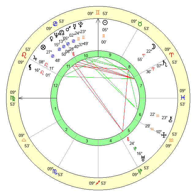 | Sun | 5 Gemini 0 | 5 Gemini 42 | 27 Virgo 19 |