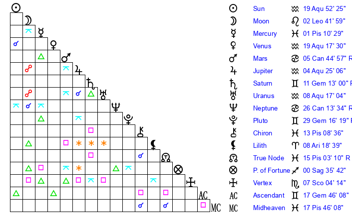 | Sun | 19 Aquarius 52 | 20 Aquarius 57 | 9 Gemini 8 |