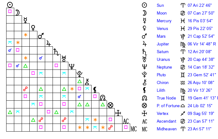| Mars | 21 Capricorn 54 | 22 Cancer 34 | 0 Aries 32 |