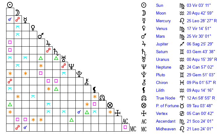 | Venus | 17 Virgo 15 | 1 Leo 13 | 5 Aquarius 44 |