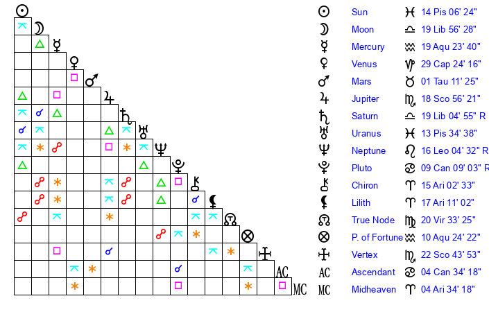 Sun | 14 Pisces 6 | 15 Pisces 22 | 23 Gemini 33 |