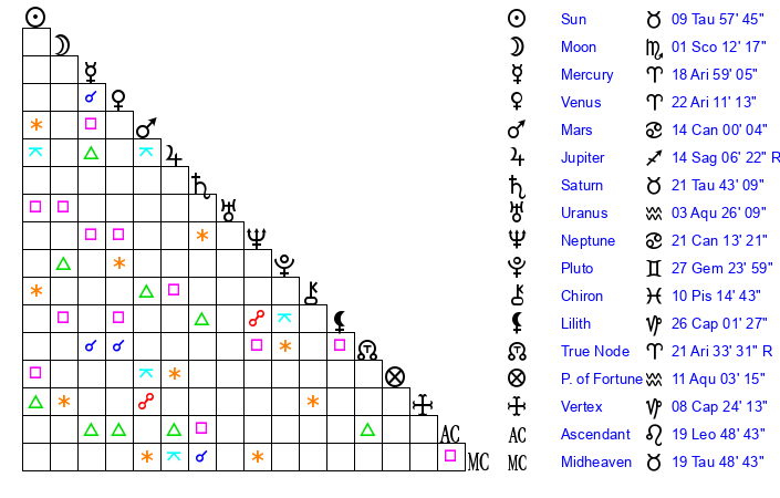 | Saturn | 22 Taurus 17 | 27 Pisces 44 | 4 Gemini 9 |