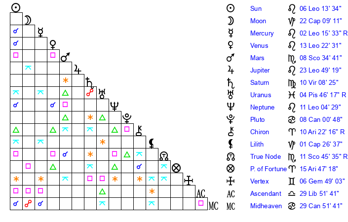 Sun | 6 Leo 13 | 6 Leo 49 | 19 Scorpio 1 |