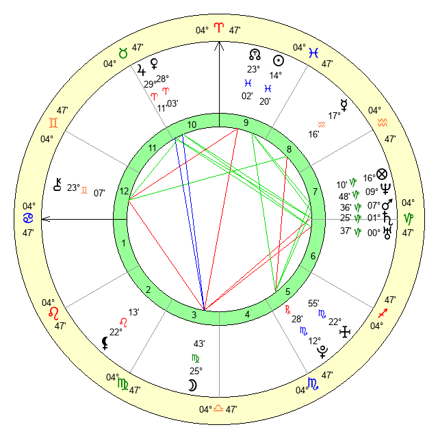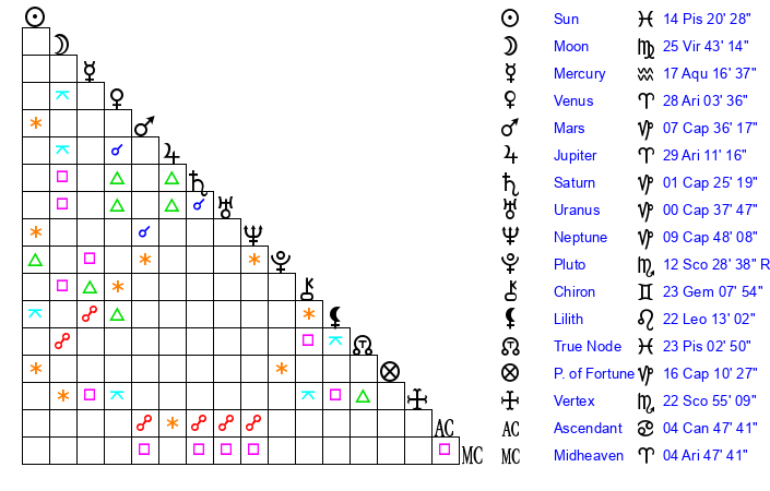 | Moon | 25 Virgo 45 | 18 Taurus 21 | 2 Aquarius 53 |